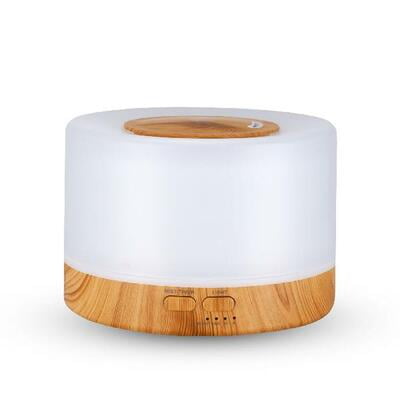 Aroma Diffuser, Light Wood Color, 500ml capacity, H 11cm, W 16.3cm, 1 hour, 3 hour, and 6 hour run options, auto shut off when water runs out, LED 7 colors automatically.